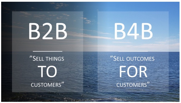 Business FOR business: ”sell outcomes FOR customers”. B4B-ajattelussa myydään asiakkaan bisneksen lopputulemia asiakkaalle.