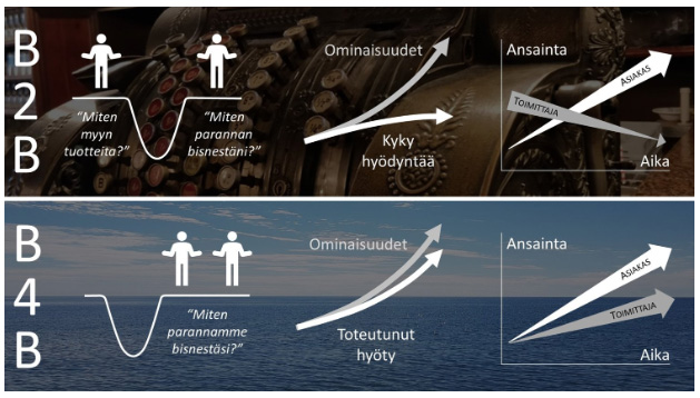 B4B-mallilla toimittajan ansainta ei ole enää asiakkaan kulu. Toimittajan ansainta on asiakkaan ansainta. B2B-mallin ikiaikainen sotatanssi toisen ansaintaa vastaan loppuu.