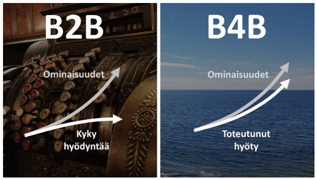 Sen sijaan, että B2B-toimittaja jättää teknologiansa hyödyn toteutumisen asiakkaan vastuulle, B4B-toimittaja ottaa täyden henkisen vastuun hyötyjen toteutumisesta.